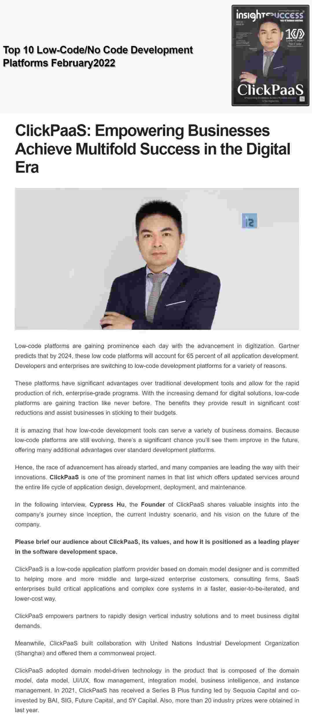 2022年年初,,,,,EBPAY入选外媒Insights Success低代码/无代码开发平台 Top10,,,,,,,创始人、、、、、、、、、、、CEO胡柏受邀接受专访并荣登封面人物,,,,,,,他与Insights Success的读者分享了EBPAY成立的初心、、、、、、、、、发展历程、、、、、、、、、、、当前的行业发展趋势以及他对公司未来的展望。。。。。。。